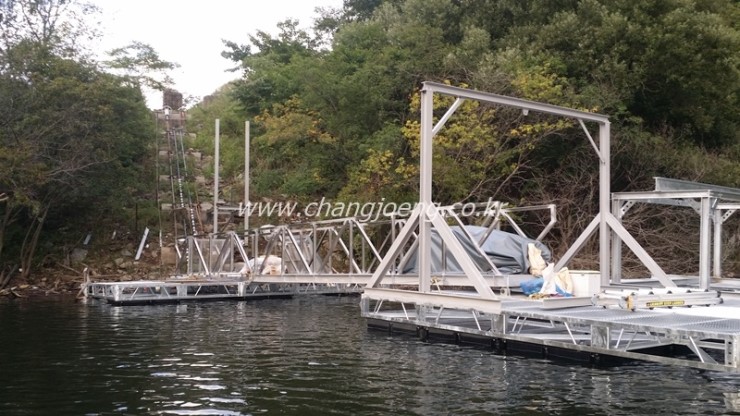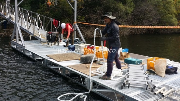 취수바지선 공사 장소 : 소요기간 : 호수나 저수지에서 물을 끌어올리려 할 때 호수의 수위변동에 맞추어서 오르내리는 취수 바지선이 필요합니다. 이번현장은 바닷가 부잔교처럼 10미터이상 수위가 변동할때도 대응할 수 있게 씨플렉스 로프를 사용하고 연결도교와 바지선연결 및 여러 바지선을 힌지연결하여 최대한 안정된 상태에서 취수할 수 있도록 설계시공하였습니다. 시공에 참여하신 박훈부장님, 박광원실장님, 경용씨 씨플렉스 강성영부장님외 시공팀 모두 수고 많으셨습니다.