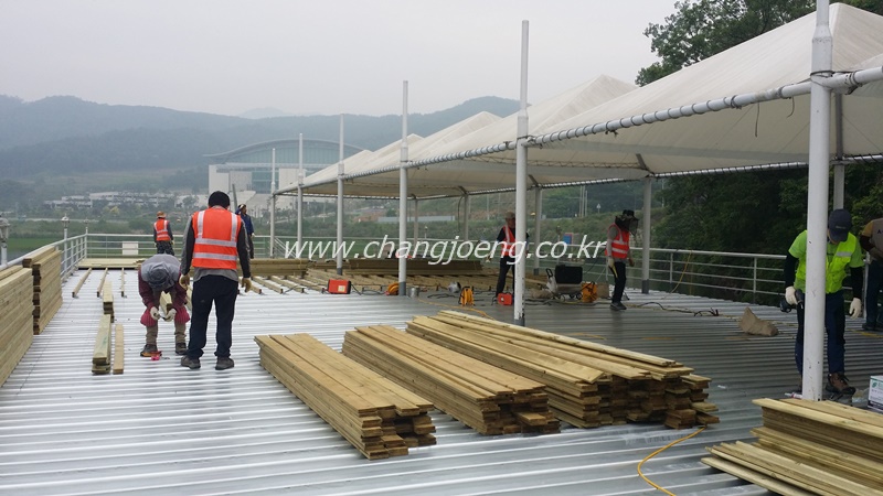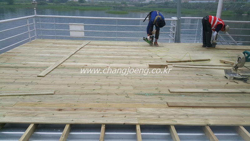 선착장 2층바닥으로 사용하는 물먹은 샌드위치판넬을 철거하고 데크를 시공하는 공사입니다.